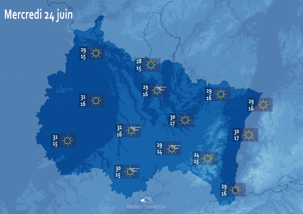Pour la journée de demain mercredi 24 juin 2020, l’anticyclone nous apporte un ciel bien dégagé hormis le passage d’un voile d’altitude. Au réveil le mercure affiche entre 14 et 17°C avant une après-midi très chaude. En effet, les maximales attendues se situent entre 28 et 32°C. Le vent de secteur Est permettra de mieux supporter cette chaleur puisque les rafales souffleront entre 20 et 35km/h.