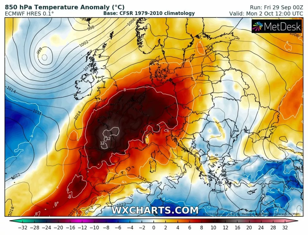 Image d’illustration : températures vers 1500m via www.wxcharts.com. L’excédent thermique est conséquent y compris en altitude.